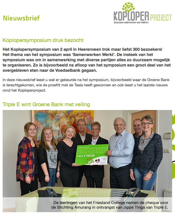 De nieuwbrief van het Koploperproject is weer uit. In deze nieuwsbrief leest u wat er gebeurde na het geslaagde Koplopersymposium op 2 april. Bijvoorbeeld waar de Groene Bank is terechtgekomen, wie de proefrit met de Tesla heeft gewonnen en ook leest u het laatste nieuws rond het Koploperproject. En natuurlijk het nieuws over DZyzzion! Lees hier de hele nieuwsbrief.